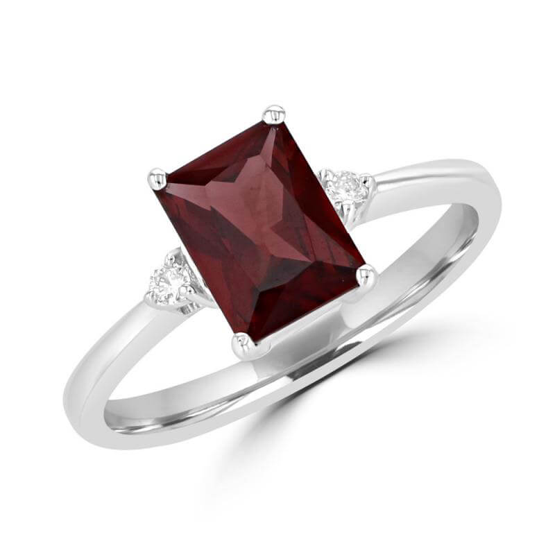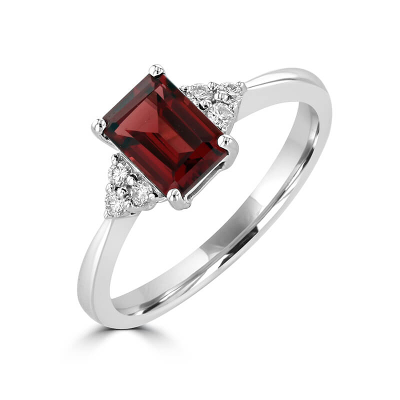 5X7 EMERALD CUT GARNET WITH THREE DIAMONDS ON EACH SIDE RING