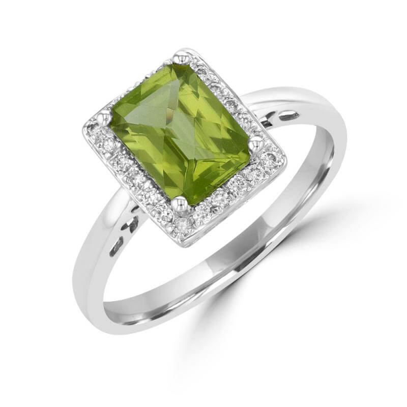 6X8 EMERALD CUT PERIDOT SURROUNDED BY DIAMOND RING