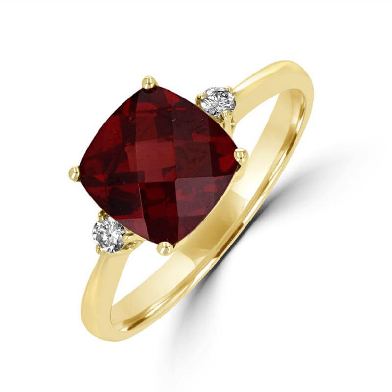 8MM CUSHION GARNET AND ONE ROUND DIAMOND ON EACH SIDE RING