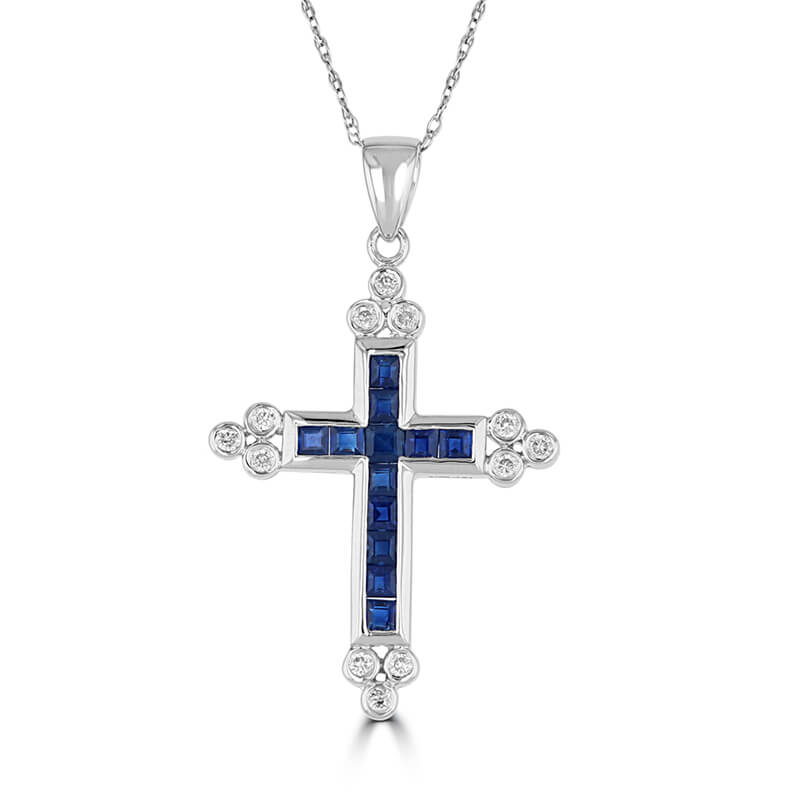 SQUARE SAPPHIRE & ROUND DIAMOND CHANNEL CROSS (CHAIN NOT INCLUDED)