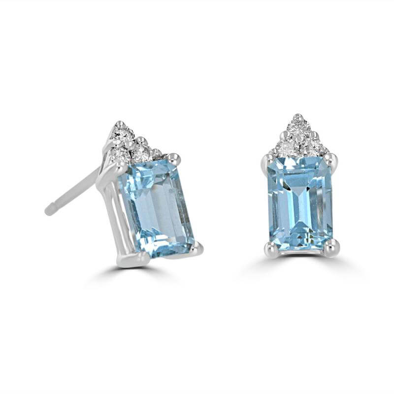 4X6 BAGUETTE AQUAMARINE AND THREE DIAMONDS ON TOP EARRINGS
