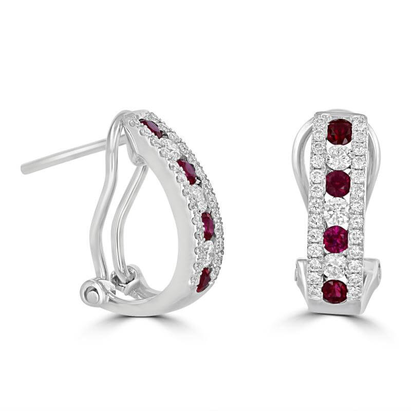 ROUND RUBY & ROUND DIAMOND OMEGA BACK HOOP EARRINGS