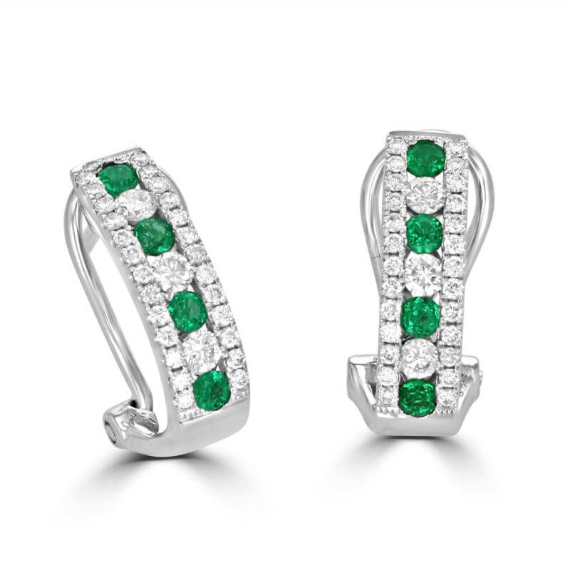 ROUND EMERALD & ROUND DIAMOND OMEGA BACK HOOP EARRINGS
